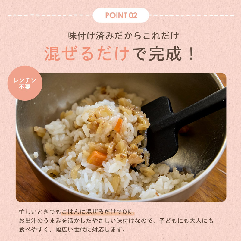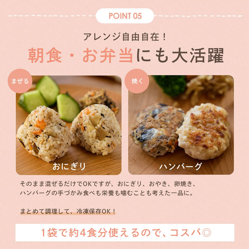 鶏肉、ごぼう、かつお節、にんじん、干ししいたけ、こいくち醤油(小麦・大豆を含む)、本みりん、酒、ひじき、三温糖、片栗粉